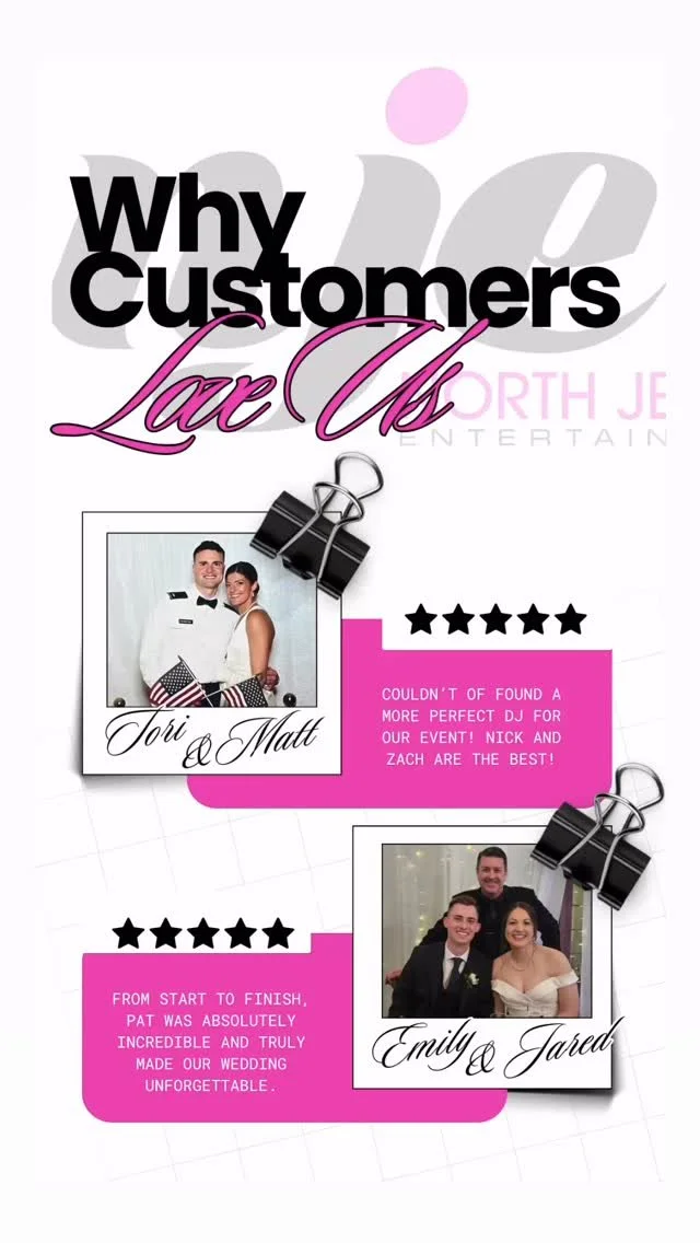 With over 300+ online reviews, North Jersey Entertainment is not your typical DJ company. We are a diverse team of incredibly talented, enthusiastic, and modern-styled professionals that have real passion for what we do. We have two goals: a packed dance floor and happy guests, without the "cheese." We carefully plan and execute every detail with you, so you can focus on having fun with your friends and family on your special day. See why we’re rated the best wedding DJs in NJ, PA and NY year after year.